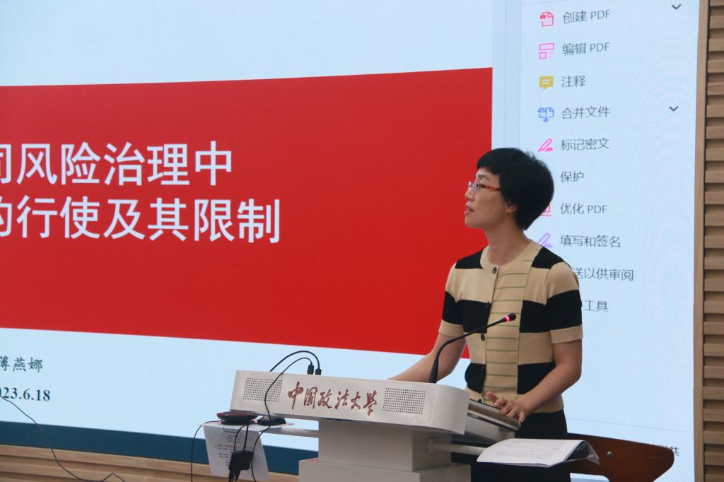 公司教授薄燕娜做主题为“保险公司风险治理中股东权利的行使及其限制”的汇报。她从保险公司风险治理的概念、股东权利行使及其限制的规范检视、股权行使限制的法理基础、股权行使限制的权力边界、股权行使限制的规范路径和入法建议等角度着手展开讲解,内容不仅涵盖自益权和共益权的行使、强制注资、穿透式监管、美国力量源泉原则、股东加重责任、自治与共治和法律法规间的衔接等问题,还涉及大量美国、日本和德国的比较法研究。她的汇报全面系统地阐明了“保险公司股东权利的行使及限制”这一特殊问题,启发了其他学者对保险公司治理的深入思考。