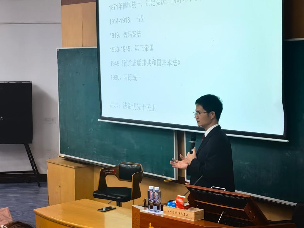 首先,谢立斌以严谨而不失风趣的言语从德国宪法史、宪法原则、国家组织与基本权利四个角度向同学展示了德国宪法基本内容。虽是掠影,但也加深了同学们对于德国宪法的理解与认识,赢得了同学们的阵阵掌声。