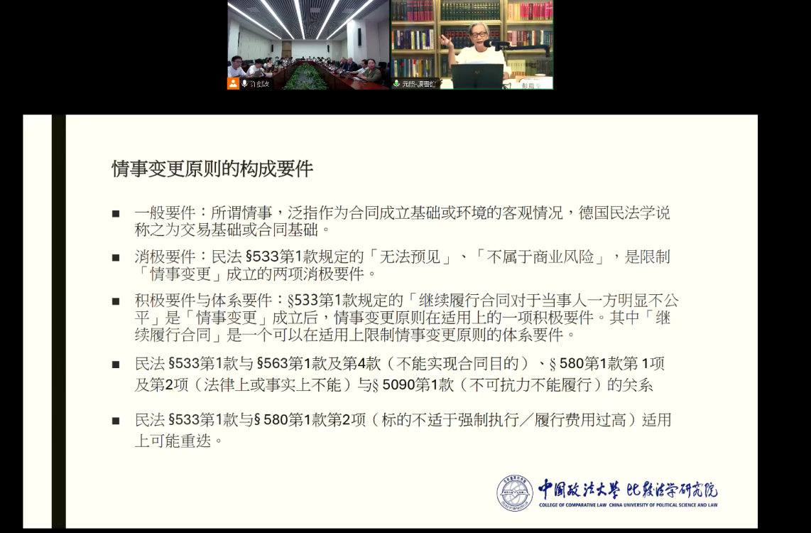 彭凤至深入讲解大陆《民法典》533条与我国台湾地区民法第227-2条第1款的联系与区别,分别分析大陆和台湾地区有关“情事变更”的构成要件,并讲授两岸“情事变更”的适用规则。此外,她结合台湾“情事变更”的立法背景及德国民法典的相关规定,剖析了台湾地区情事变更原则应当如何正确运用的问题,从而进一步阐明了其与大陆民法典533条的区别与联系。
