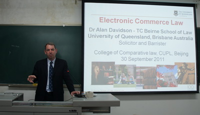 9月29日晚,澳大利亚昆士兰大学法公司Dr. Alan Davidson教授做了“澳大利亚电子商务法”方面的专题讲座。结合其最新著作,Davidson教授介绍了现今电子商务发展对日常生活的正负面影响,并以此为引,结合当今世界的区域性组织以及国际统一商务立法的整体情况,向在座师生集中介绍了有关电子签名、知识产权、隐私保护等法学研究的前沿问题。讲演完毕后,师生就讲座中争议焦点踊跃向Alan教授进行提问,也得到教授的耐心解答。