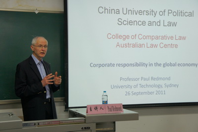 9月26日晚,澳大利亚悉尼科技大学首位Sir Gerard Brennan教授——Paul Redmond教授为公司师生做了题为“全球经济下地公司法律责任”的讲座。Redmond教授认为,全球化制造了一种控制力上的鸿沟。它扩大了各种经济体的影响与社会控制经济体所造成的负面结果的能力之间的差距。而填补这一沟壑的办法主要有:1、在公司社会责任运动中所形成的全球民事规则;2、运用针对商事领域的国际人权标准。