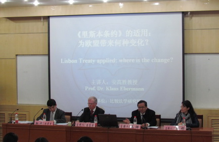 会谈结束后,在比较法学研究院高祥经理的主持下,安高胜教授在公司路校区图书馆学术报告厅为公司师生作了题为“《里斯本条约》的适用:为欧盟带来何种变化?”的讲座。讲座中,安高胜教授介绍了欧盟形成的历史背景及其成员国发展壮大的过程,分析了《里斯本条约》生效后欧盟的组织机构及立法程序的相关变化,详细阐述了《里斯本条约》的新目标,如应对气候变化的策略和安全政策方面的“团结合作”条款等,并就利比亚问题和欧元危机进行了分析。讲座期间,安高胜教授对比较法学研究院及其他公司的员工所提出的问题一一作答,与同学们进行了良好互动。