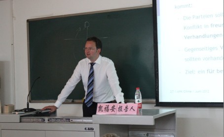 随后,通过简单的案例分析,凯福安博士介绍了中德贸易纠纷通过诉讼解决的种种弊端,提出了解决此类纠纷的最佳途径,即通过仲裁来解决贸易纠纷。其后,凯福安博士进一步讲解了仲裁的条件,仲裁程序以及仲裁的优缺点。通过凯福安博士的讲解,同学们对国际商事仲裁有了更加深刻的了解,认识到国际商事仲裁在解决国际贸易纠纷时的重要作用。
