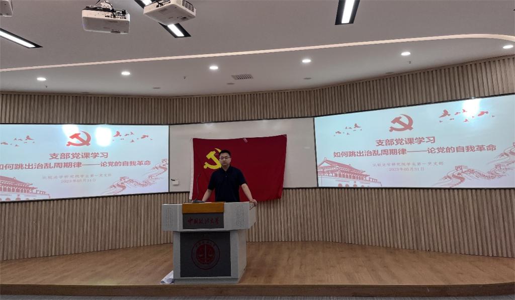 在党课伊始,支部书记金矗首先从“黄炎培之问”出发,引入了党课主题:如何使我们的政党和国家跳出“其兴也勃焉,其亡也忽焉”这一历史规律的支配?针对黄炎培先生的问题,毛泽东同志给出的答案是民主,只有让人民来监督政府,政府才不敢松懈。毛泽东同志所讲的民主绝非西方的选举式民主,而是全过程人民民主,人民群众可以广泛参与到民主选举、民主协商、民主决策、民主管理、民主监督之中。金矗还谈到,习近平总书记对历史周期律问题的新解答是进行自我革命,习近平总书记指出勇于自我革命是我们党永葆青春活力的奥秘所在,也是我们党战胜一切艰难险阻的动力源泉。作为中国共产党的一份子,每位党员都应当从自身做起,扎实开展批评与自我批评,从而永葆党的先进性、纯洁性和青春活力,争取人民的拥护和支持。