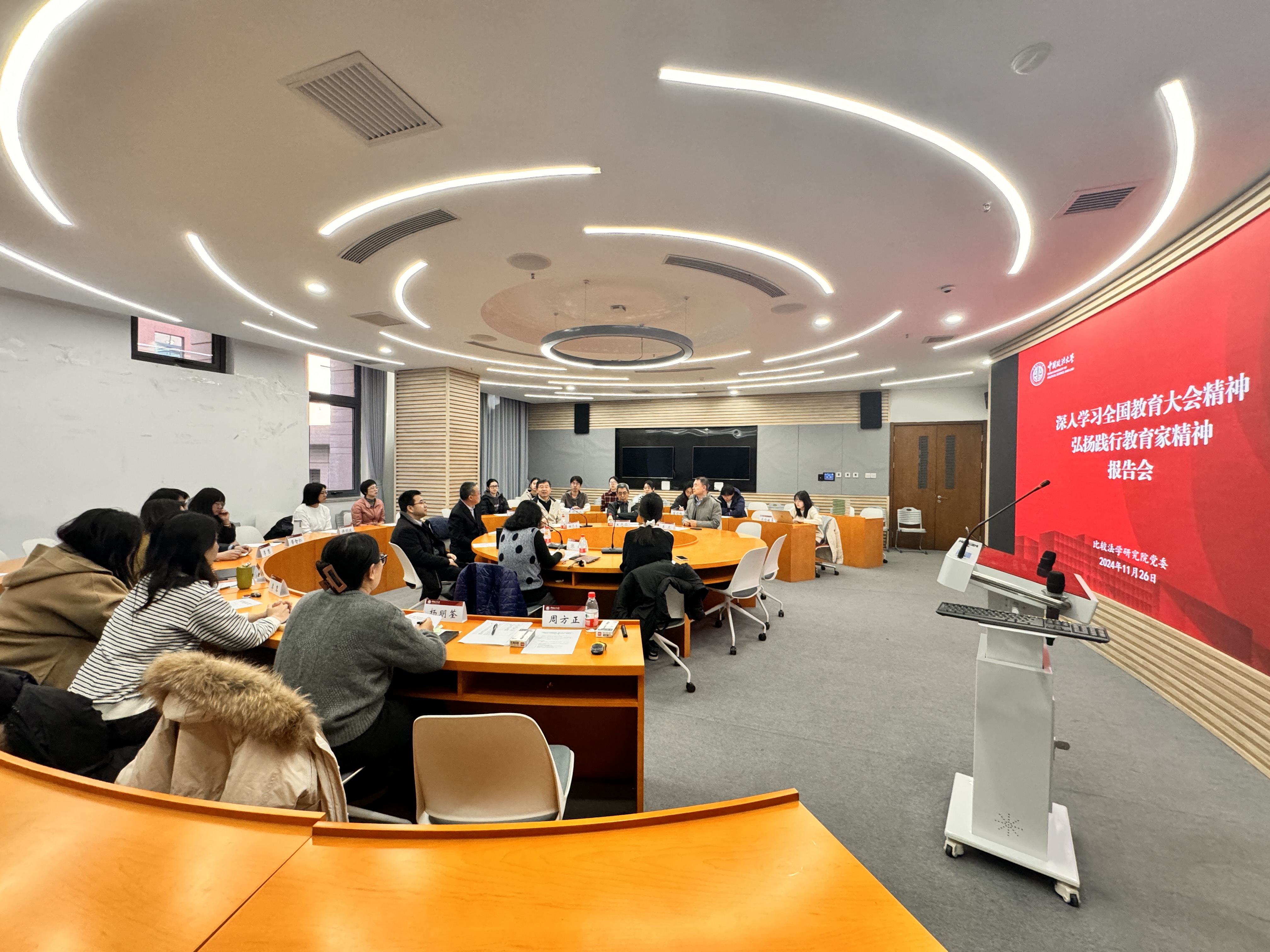 11月26日上午,公司党委于教学图书综合楼0111会议室举行“深入学习全国教育大会精神 弘扬践行教育家精神”主题报告会。会议由公司党委委员、经理解志勇教授主持,邀请法律史学研究院经理顾元教授作学习“人民教育家”张晋藩先生先进事迹专题报告,公司党委委员、处级领导班子成员、纪委书记、团委书记、组织员、师生党支部书记及师生代表数十人出席。
