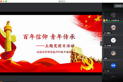 4月15日,2018级中德班团支部线上召开党团支部大会,开展主题团日活动。刘沛晔同学为大家讲述了“陈望道误把墨水当糖水”的党史故事。此外,团支部通过分享“首都百万师生同上一堂党史课”、“党史百年天天读”等党史学习教育平台,号召各位团员能够真正在生活中、在学习上做到学史明理、学史增信、学史崇德、学史力行。