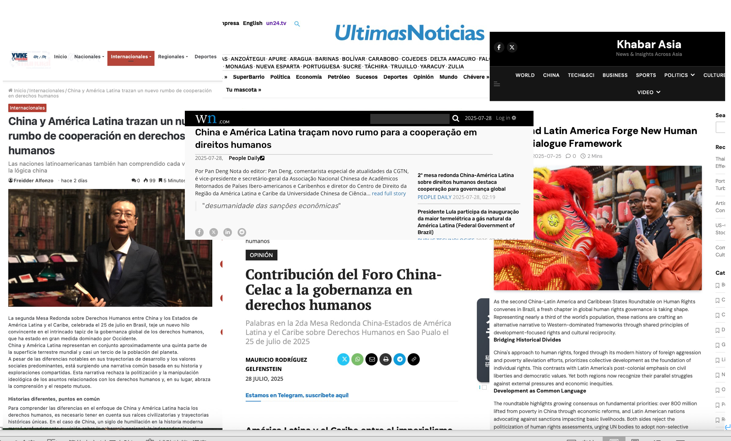 文章多语种版陆续刊载后,拉美和美国一些区域性主流网站对文章进行了转载,多地网站、自媒体和社交账号对主要观点进行了选用,达到了较好的二次传播,对于帮助民众理解中国人权,了解中国人权事业成就起到了助力作用,通过议题引导、舆论塑造有力配合了我国在拉美开展的重要法治活动。