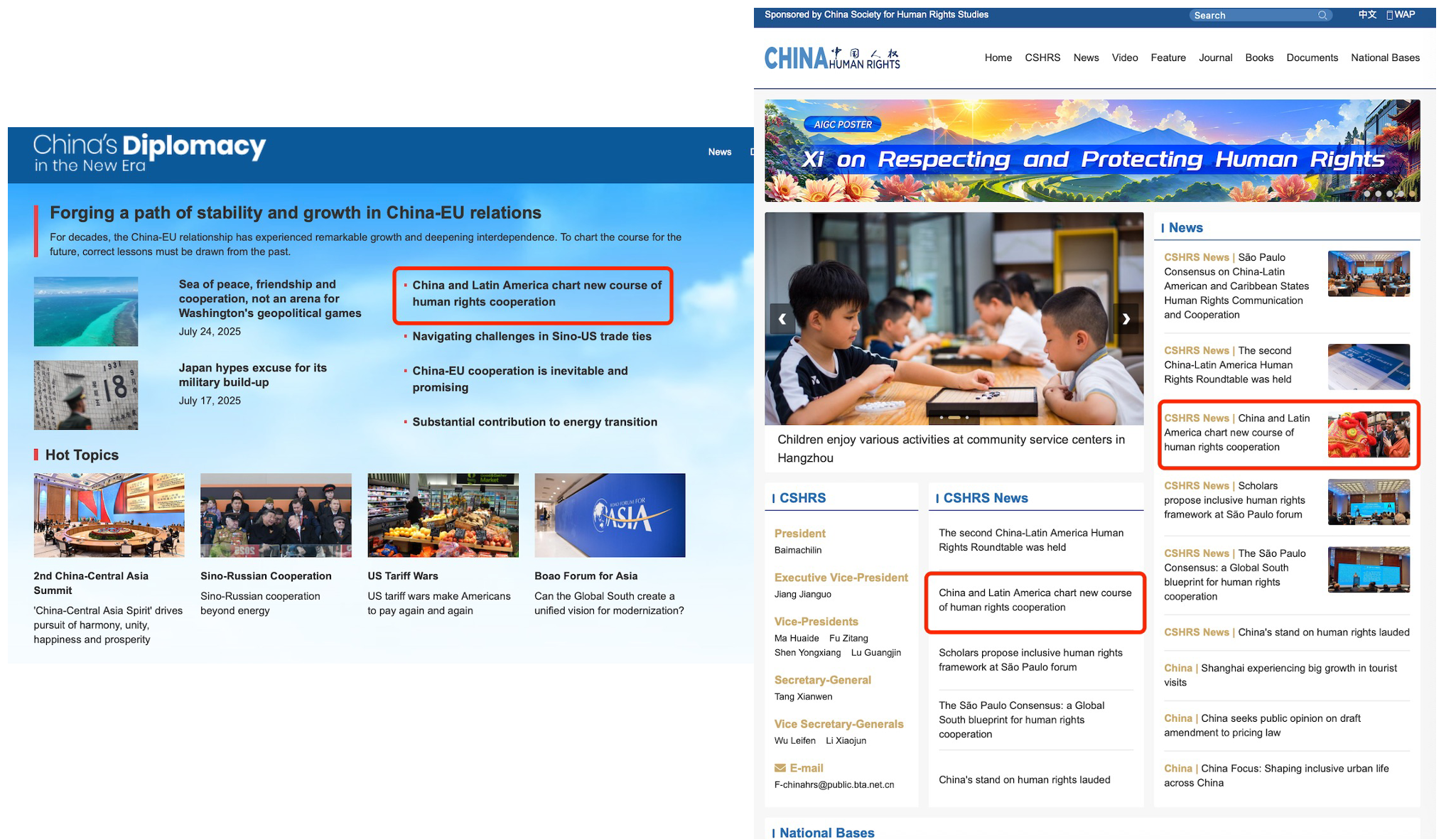 当地时间7月25日,第二届中拉人权圆桌会在巴西圣保罗举办。公司副教授潘灯撰写的评论《中拉共塑人权合作新路径(英文)》当日在中国互联网新闻中心和外交部国际问题研究院承办的习近平外交思想和新时代中国外交网(英文版)首页、中国人权研究会主办的中国人权网(英文版)首页刊载。央视英语频道官网(CGTN)和西班牙文网(CGTN en español)评论首页、人民网葡文版首页分别于25日、26日和28日在显著位置用英语、西班牙语和葡萄牙语对该文进行了全文刊载。