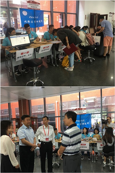 9月4日,在研究院老师的带领下,院研究生会的同学们在综合科研楼一层B段布置了比较法学研究院的“一站式”迎新展台,迎接2018级新生的到来。展台分为两组,每组按照核验证件、收取材料、领取材料进行分工,新生报到现场有条不紊、井然有序。
