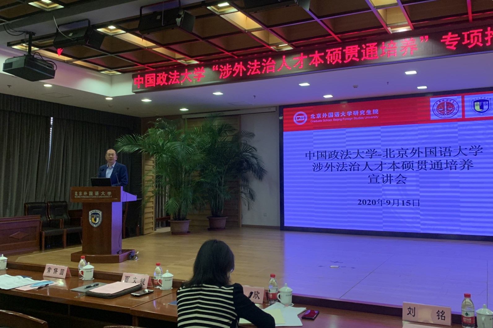 The Special Seminar on the Promotion and Exemption of Student Enrollment of the CUPL-BFS Foreign-Related Legal Personnel Master Pass-Through Training Programme was held at the Beijing Foreign Studies University (BFS) on the morning of 15 Sept, 2020.