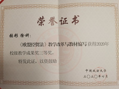 9月10日,公司欧盟法研究所所长张彤教授主持、徐妍副教授参与的“《欧盟经贸法》教学改革与教材编写”获公司2020年校级教学成果奖三等奖。