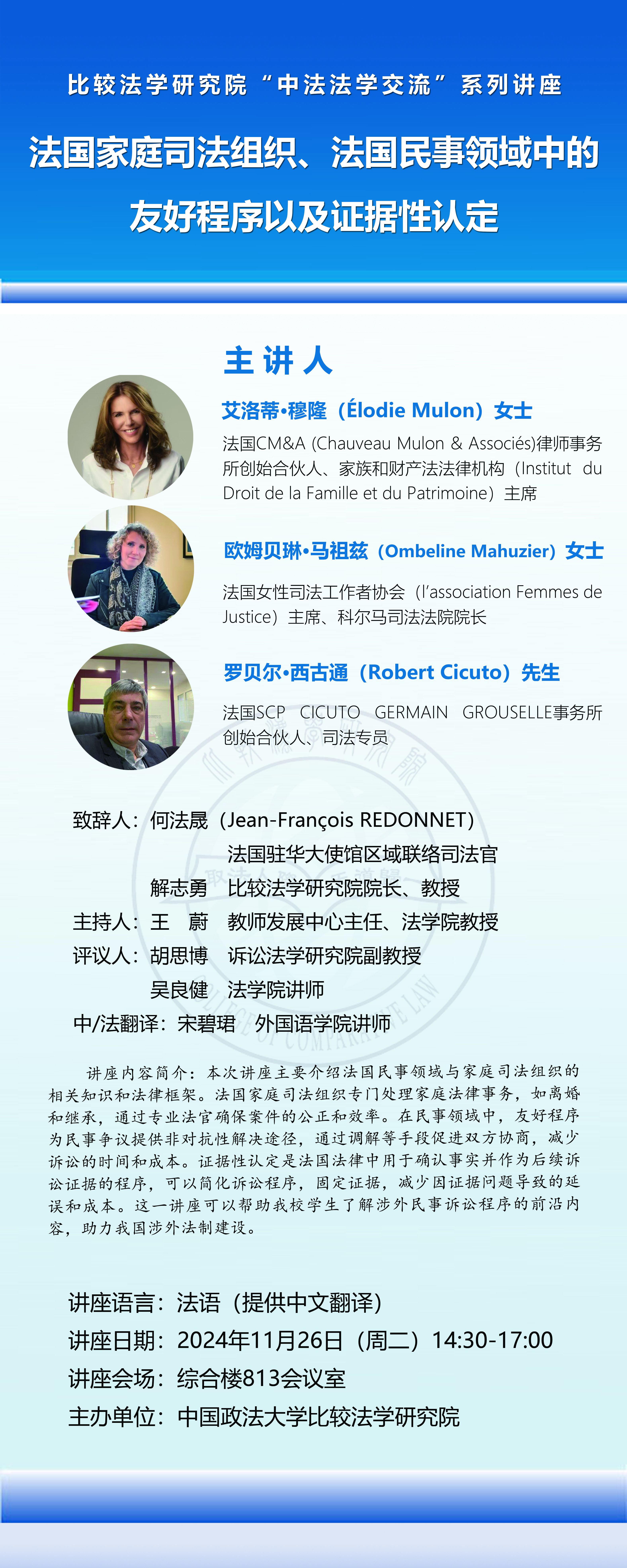 讲座通知:法国家庭司法组织、法国民事领域中的友好程序以及证据性认定