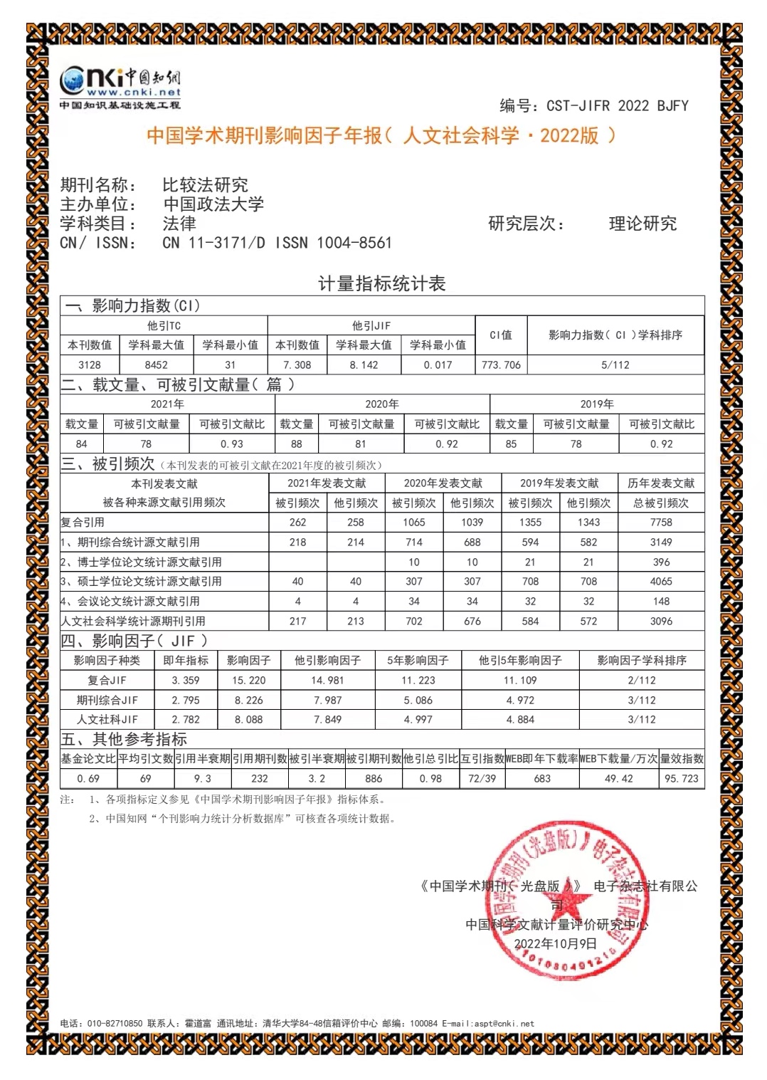 10月26日,根据中国知网发布的《中国学术期刊影响因子年报》(人文社会科学·2022年版),《比较法研究》复合影响因子排名第二,期刊综合影响因子排名第三,人文社科影响因子排名第三。《比较法研究》办刊取得新的突破。