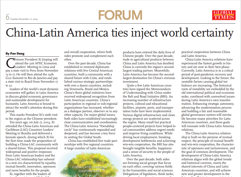 11月13日至21日,国家主席习近平出席亚太经合组织第三十一次领导人非正式会议、二十国集团领导人第十九次峰会并对秘鲁、巴西进行国事访问。行前及出访期间,公司副教授潘灯通过撰写评论、接受采访等方式,解读新时代中拉关系丰富内涵,展望中拉合作光明前景。