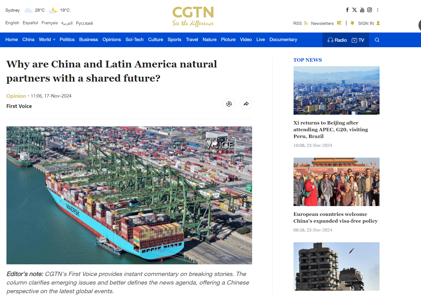 11月17日,习近平主席结束秘鲁行程前夕,央视英文频道以评论特稿形式刊载潘灯评论文章《中国和拉美为什么是天然的命运共同体》。文章以外国受众习惯的文风介绍了中拉命运共同体从愿景到现实取得的丰硕成果,解读中拉关系为什么有别于传统合作模式,展望中拉命运共同体的下个十年将更加可期。该文经频道头屏发布和网站推送后在国外网站、广播、社交媒体得到了二次传播。