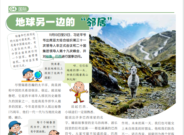 11月20日出版的《中国少年报》还整版刊发了潘灯发表的《地球另一边的“邻居”》一文。文章以义务教育阶段员工为阅读对象,向青少年普及秘鲁、巴西以及南美洲相关情况,尤其是与中国交往情况,希望他们能把中拉传统友谊传承下去,发扬光大。