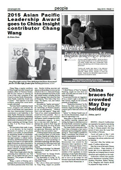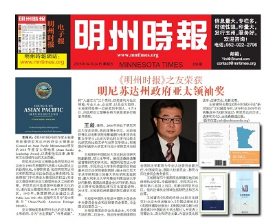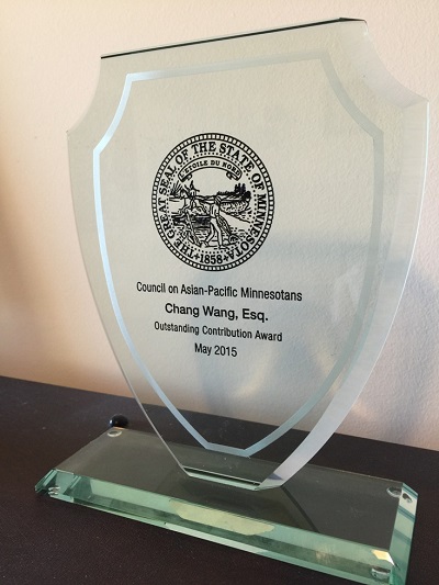5月8日,公司王昶副教授获得美国明尼苏达州政府亚太理事会 (Council on Asian Pacific Minnesotans) 颁发的“2015年度亚太领袖 - 杰出贡献奖” (Asian Pacific Leadership Award–Outstanding ContributionAward),表彰他在法律、教育和文化领域作出的杰出贡献。州政府亚太理事会为获奖者举行晚宴并颁奖, 400多位政府官员和亚太社区代表出席了典礼。