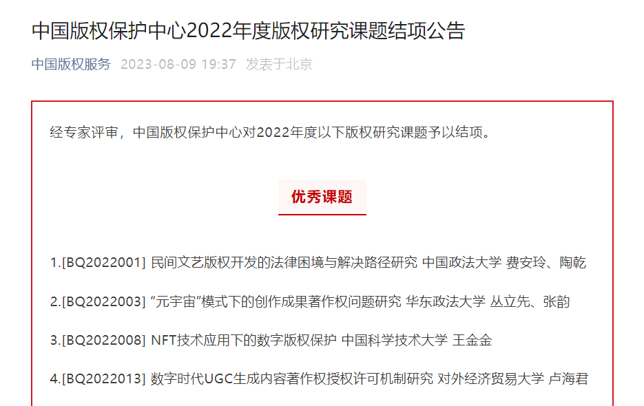 8月9日,公司费安玲教授主持研究的课题《民间文艺版权开发的法律困境与解决路径研究》成功结项,并获得中国版权保护中心2022年度版权研究优秀课题。