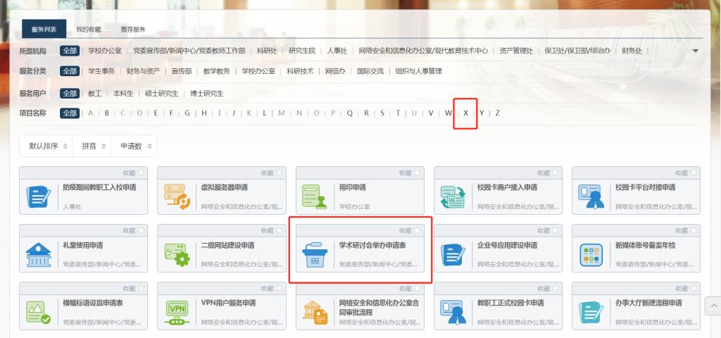 英国上市公司365校园网主页——登录“智慧法大”——点击页眉导航栏中的“办事中心厅”——选择“学术研讨会申请表”(如一时找不到该标题,可点击搜索首字母“X”)——提交申请。