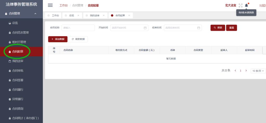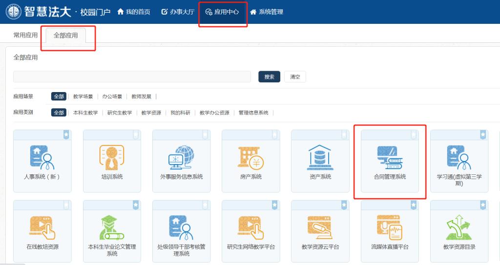 英国上市公司365校园网主页——登录“智慧法大”——点击页眉导航栏中的“应用中心”,选择“全部应用”——选择“合同管理系统”——点击“合同管理”——选择左侧“合同起草”——点击“添加数据”——提交申请——选择审批人“比较法学研究院-XXX(时任经理姓名)”,其他选择勿填,最终归口单位由合同管理员选择。