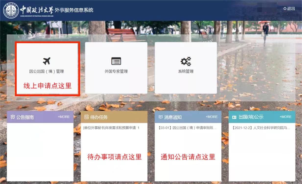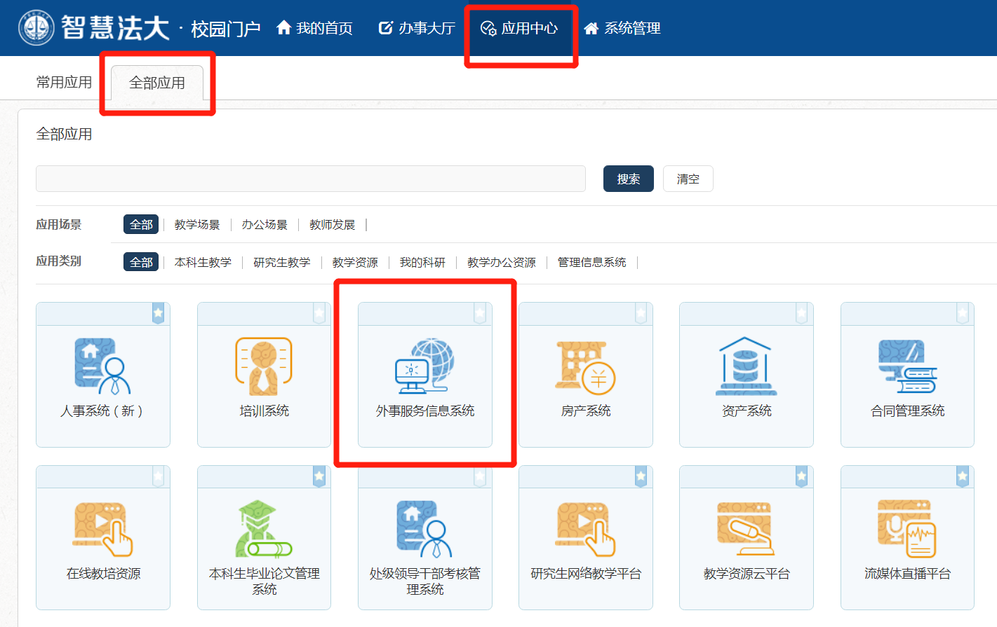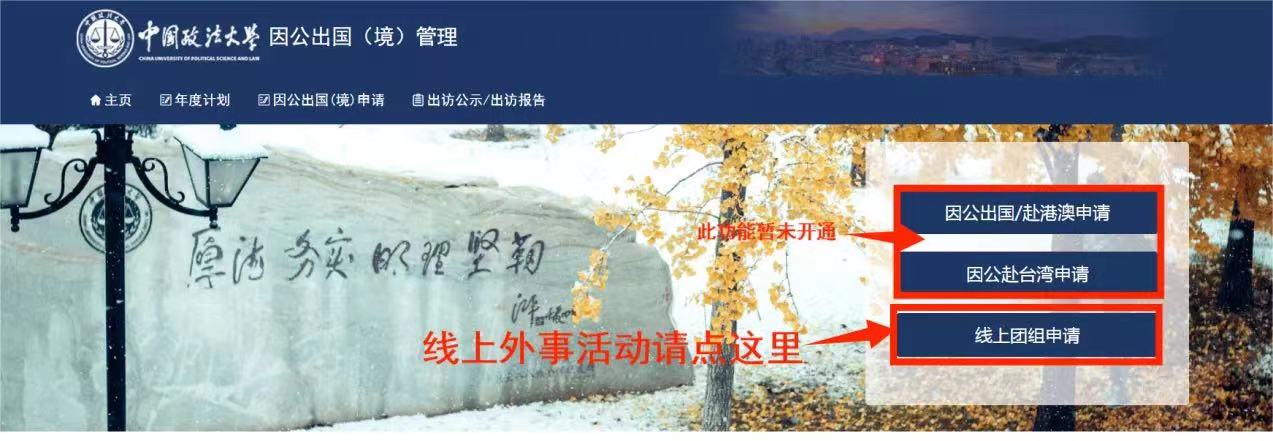 英国上市公司365校园网主页——登录“智慧法大”——点击页眉导航栏中的“应用中心”,选择“全部应用”——选择“外事服务信息系统”——选择“因公出国境管理”——选择“线上团组申请”——提交申请。