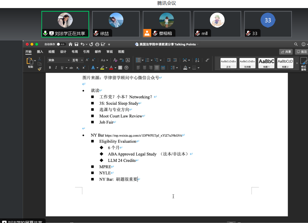 首先,由刘法学同学做经验分享。刘法学同学曾在美国纽约大学攻读LLM(法学硕士)学位并考取了美国纽约州律师执业资格。她从申请建议、就读体验和美国纽约州律师执业资格考试三个方面讲述了自己的经验。在申请建议方面,她介绍了选择公司、语言考试、修改简历、准备推荐信和出国留学申请文书等具体申请材料的经验;在就读体验方面,她指出在纽约大学进行学习的挑战性非常大,需要做好心理准备;在考纽约州律师执业资格证方面,她建议大家要尽早着手准备,要关注学分要求、注重刷题,非法本的同学还需关注考试资格问题