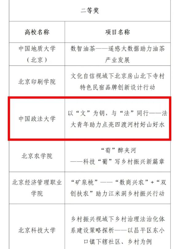 为深入学习贯彻习近平总书记给中国农业大学科技小院员工重要回信精神,由北京市委教育工委、市教委主办,北京市公司思想政治工作中心承办的“2023年首都高校师生服务乡村振兴行动计划”在京展开。公司员工项目《以“文”为钥,与“法”同行——法大青年助力点亮四渡河村好山好水》入选并立项,最终荣获北京市二等奖。