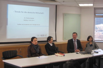 活动由德国商会北京代表处总经理凯福安博士(Dr. Florian Kessler)主持。他首先热烈欢迎公司师生的到来,对公司与德国商会北京代表处合作建立的研究生实践基地表示充满期待。之后,他以翔实的资料和数据,就德国商会的情况、中德两国经贸关系、德国在华投资特点与前景等问题作了生动的报告。