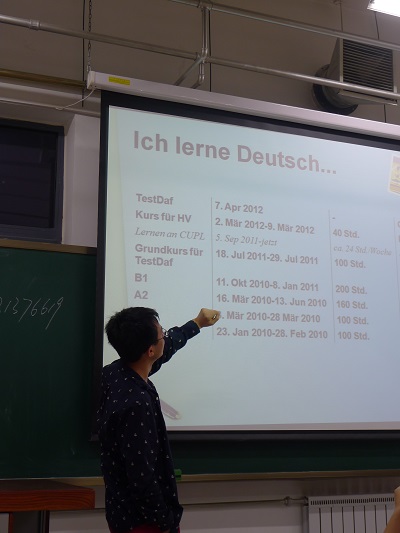 首先杨明荃老师简单介绍了本次活动目的和与会员工代表情况,之后五位同学依次上台与在座的师弟师妹分享德福考试和留德经验。陈颖同学留学于科隆大学,他介绍了在科隆大学的课程安排、联系导师、在德生活等各方面的经历;粟佳音同学留学汉堡大学,她不仅介绍了汉堡大学的学习安排和汉堡的便利生活,还应师弟师妹要求着重介绍了在德国的实习工作;王文豪同学留学于弗莱堡大学,他详细介绍了这所坐落于小城的德国名校的法学各个方向;留学于慕尼黑大学的汪廉瀛同学则悉心准备了PPT,介绍了其德福考试的满分经验,向师弟师妹们全方位分享了选择参考书目、考试技巧等经验;留学于法兰克福大学的李海同学用简约而富有创意的PPT展示向大家介绍了法兰克福老员工活与学习。
