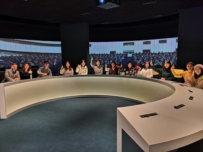 19日上午,同学们来到德国大教堂,参观了“德意志联邦共和国的议会体系”展览,以魏玛共和国时期的社会历史为切入点,了解德国议会民主制曲折的诞生历程。随后大家来到查理检查哨并参观了柏林墙主题展览。Kitze女士在与同学们的交流中讲述了自己在这场从分裂到统一的历史变革的亲身经历。下午,同学们回到联邦司法及消费者保护部,聆听了由Thomas Schaefer博士主持的“立法进程中的法律及语言审查”专题讲座。随后Richter博士陪同大家前往“欧洲议会”体验场所,以角色扮演的方式让同学们各自代表欧洲议会中的某一个党派,进行以“咖啡打包是否应该增加售价”为题的议案辩论。同学们在情景体验中更加了解了欧洲议会的运作结构及法案表决过程。