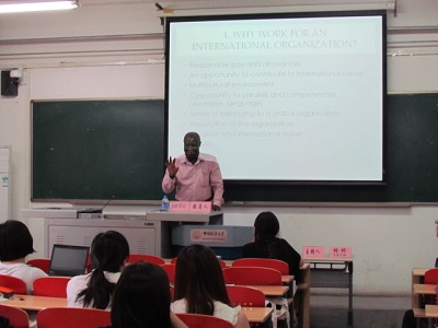 Prof. Blay's presented a detailed introduction to the value of working for an international organization, types of international organization, job genres, working opportunities for graduates, international civil service, the Young Professional Programs, the UN pay and benefits, the UN volunteers and internships.