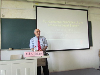 Prof. Eric S. Janus, President and Dean of William Mitchell College of Law, gave a lecture on Characteristics of the American Legal System and American Legal Education to the students on Xueyuanlu Campus yesterday afternoon. The lecture was moderated by Associate Dean of College of Comparative Law Prof. Lin Lin, Associate Prof. Wang Chang also attended it.