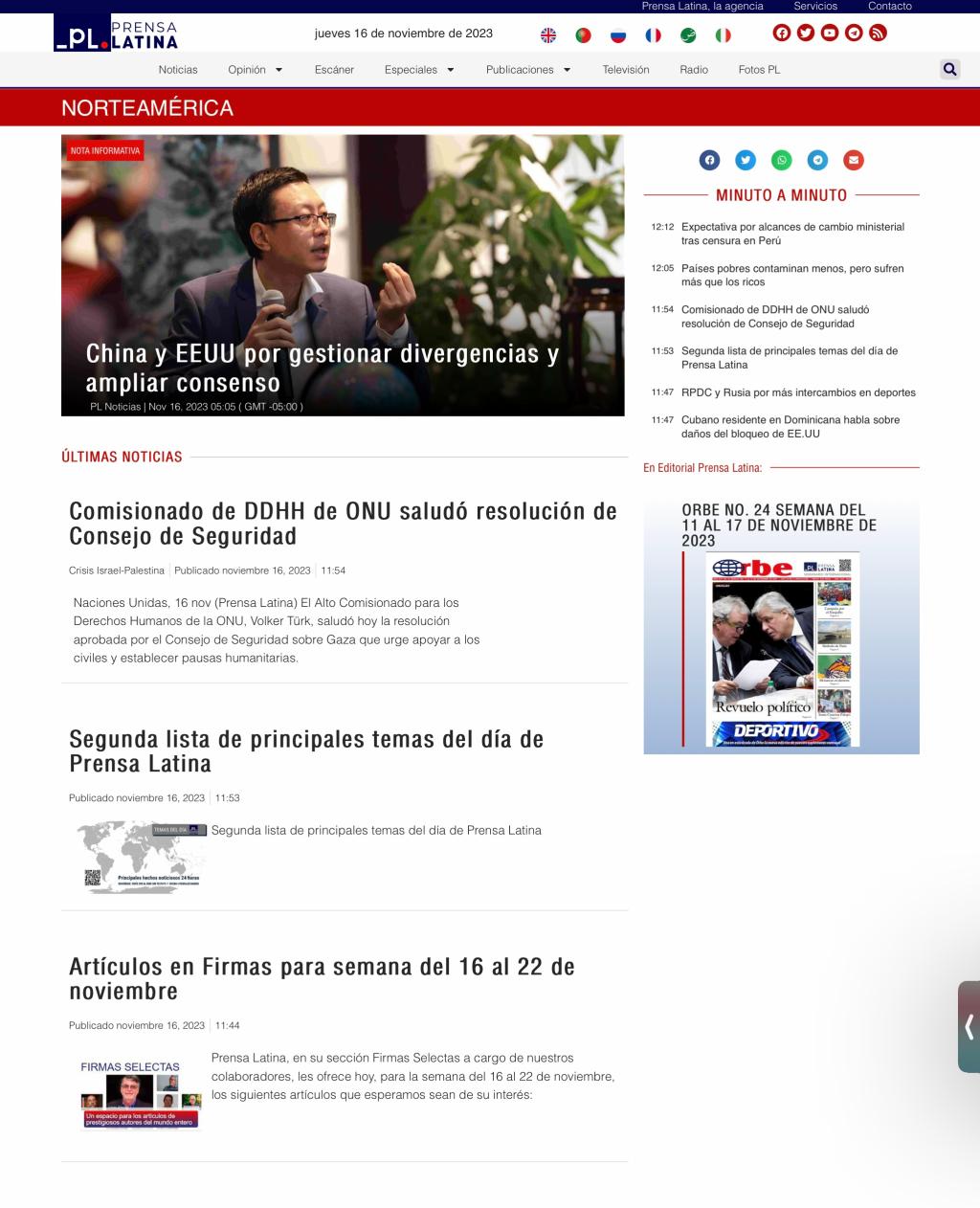 11月16日,公司副教授潘灯接受古巴国家通讯社拉丁美洲通讯社(Prensa Latina,简称“拉美社”)北京分社专访,就刚刚结束的旧金山中美元首会晤发表观点。拉美社以当日主要策划主推稿件形式将“此次元首会晤的世界意义”“造成两国当前误解和冲突的根本原因”“双方需要树立正确认知、共同管控分歧”等观点制作成新闻稿,并翻译成英文和俄文向用户进行新闻产品提供。该报道原文在拉美社官网头屏滚动发布后,在当日和次日以评论频...